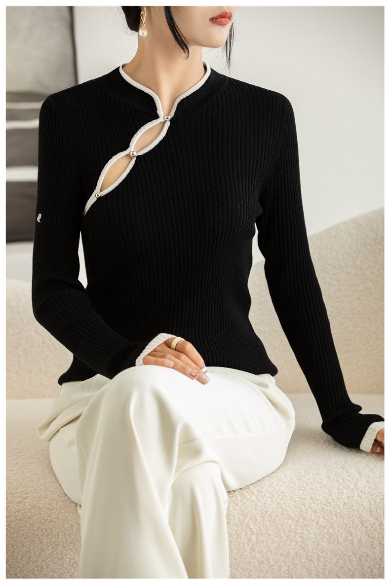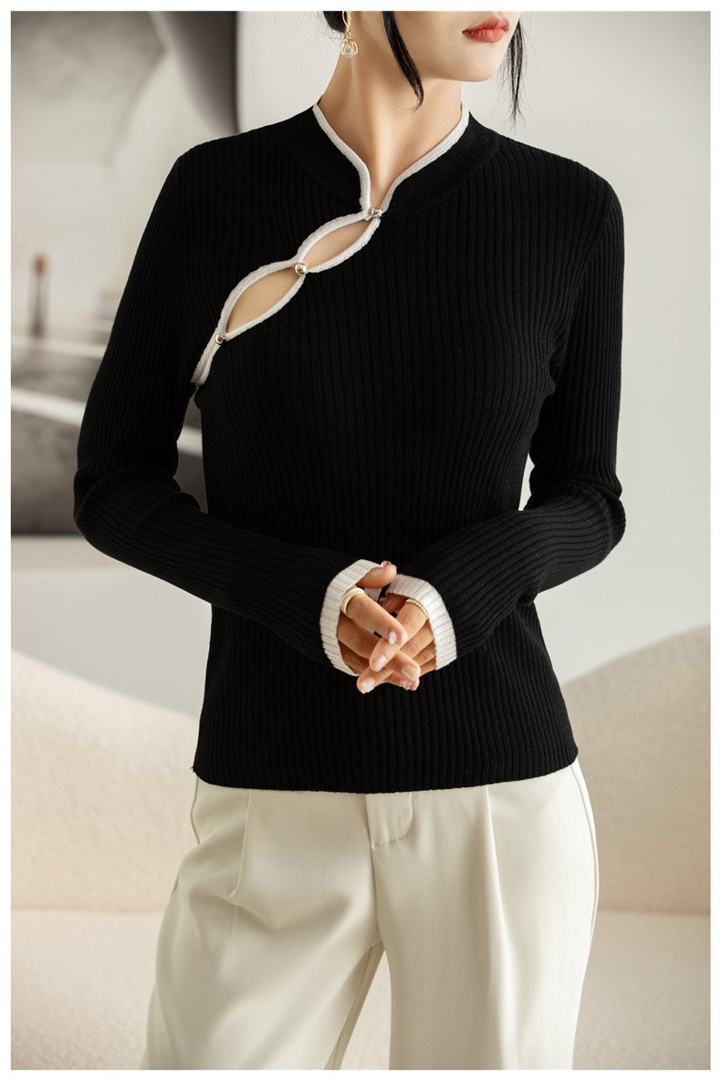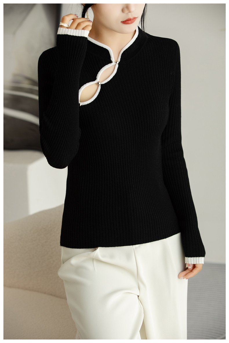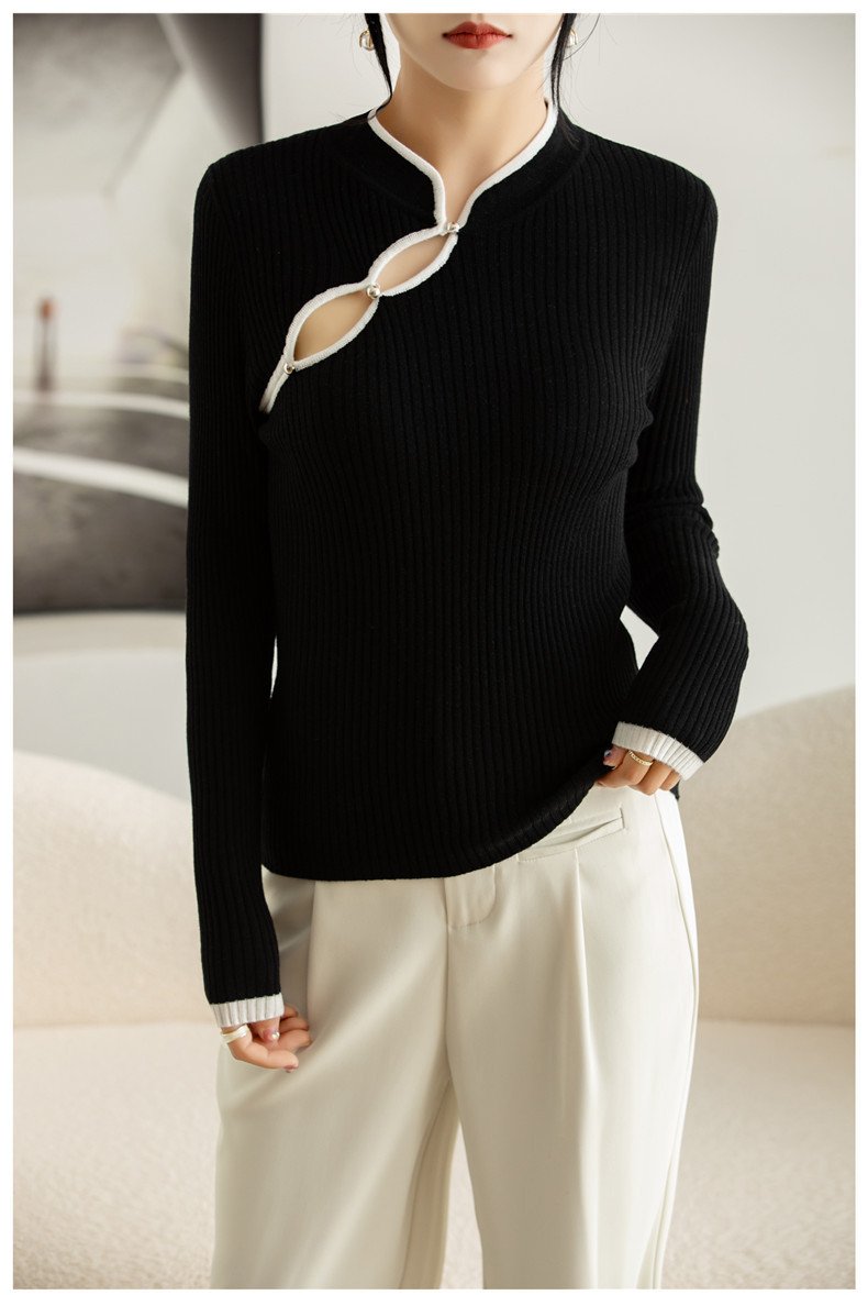 Wool Hollow-out Plate Buckle Stand Collar Design Sweater Thin